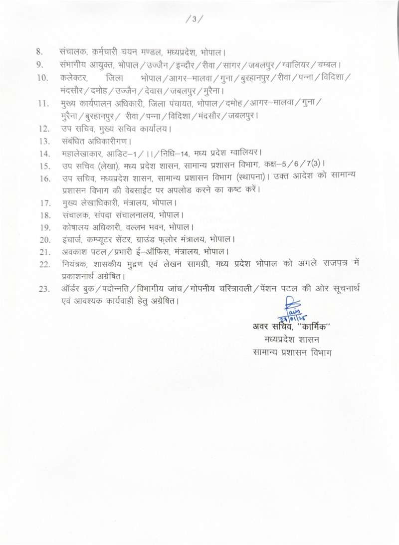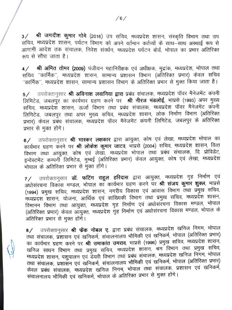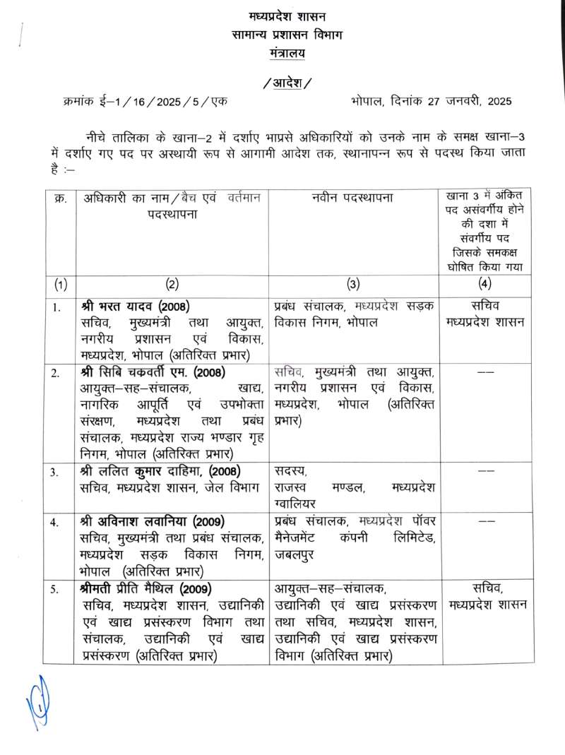 मुख्यमंत्री के सचिव भरत यादव को मध्य प्रदेश सड़क विकास निगम का प्रबंध संचालक बनाया गया है, जबकि उनके स्थान पर सीबी चक्रवर्ती एम को मुख्यमंत्री डॉ. मोहन यादव का सचिव बनाया गया है। इसी तरह आईएएस अधिकारी ललित कुमार को राजस्व मंडल ग्वालियर का सदस्य, अविनाश लवानिया को मध्य प्रदेश पावर मैनेजमेंट कंपनी लिमिटेड जबलपुर का प्रबंध संचालक, वंदना वेद को आदिम जाति क्षेत्र विकास योजना का संचालक, सत्येंद्र सिंह को एमपी स्टेट कोऑपरेटिव डेयरी फेडरेशन लिमिटेड का प्रबंध संचालक, मनीष सिंह को जेल और मध्य प्रदेश परिवहन विभाग का सचिव बनाया गया है। इसी तरह कलेक्टर खरगोन कर्मवीर शर्मा को आयुक्त सह संचालक खाद्य नागरिक आपूर्ति निगम की जिम्मेदारी दी गई है।