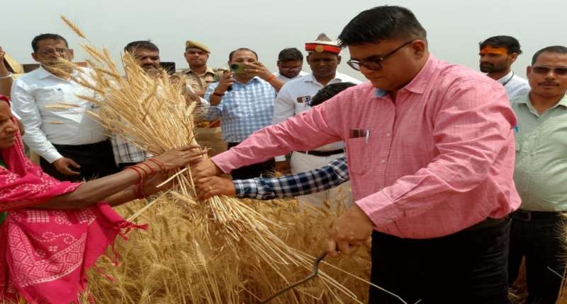 अकबरपुर तहसील में डीएम ने खेत में गेहूं की फसल की हसिया से कटाई की