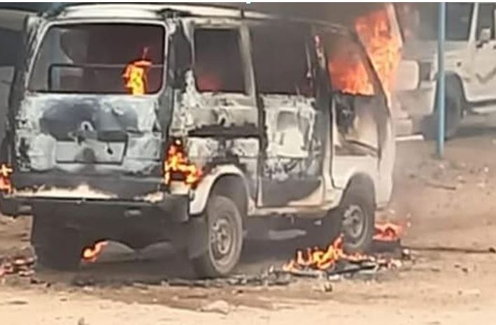 टक्कर में गई दो जिंदगियां, उग्र भीड़ ने जलाई वैन, इलाके में तनाव