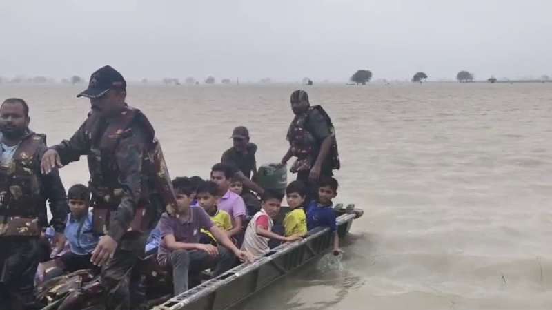 आर्मी ने बोट से बच्चों को पार कराई नदी