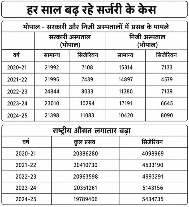 राष्ट्रीय स्वास्थ्य मिशन के आंकड़े एक चौंकाने वाला सच उजागर करते हैं। भोपाल के निजी अस्पतालों में सिजेरियन प्रसव का दर 45 प्रतिशत से अधिक है, जबकि सरकारी अस्पतालों में यह लगभग 34 प्रतिशत है। एक ही शहर और एक जैसी परिस्थितियों के बावजूद अस्पताल की श्रेणी बदलते ही प्रसव का तरीका बदल जाता है। पिछले एक दशक में प्रदेश में सिजेरियन की संख्या लगभग दोगुनी हो चुकी है। यह दर्शाता है कि वार्ड से लेकर ऑपरेशन थिएटर तक परिजनों के मन में जटिलताओं का ऐसा डर पैदा किया जाता है कि उनके पास सर्जरी की सहमति देने के अलावा कोई विकल्प नहीं बचता।