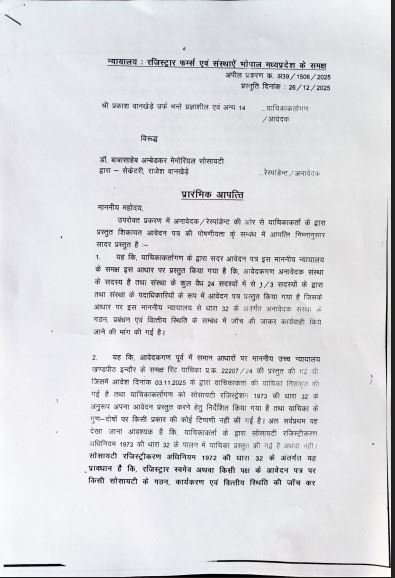 इंदौर। संविधान निर्माता डॉ. बाबासाहेब आंबेडकर नगर (महू) स्थित भीम जन्मभूमि स्मारक विवाद में माननीय हाईकोर्ट खंडपीठ इंदौर ने 3 नवंबर 2025 को धारा 32 और नियम 21 के तहत कार्यवाही के आदेश उपसचिव (उद्योग), पंजीयक भोपाल एवं सक्षम प्राधिकारी को जारी किए थे। उक्त आदेश के अनुपालन में पंजीयक, भोपाल के समक्ष जारी सुनवाई में समिति के कथित सचिव राजेश वानखेड़े ने समिति की जांच नहीं करने और आवेदकों के प्रकरण को खारिज करने हेतु आपत्ति लगाई थी। जिसको पंजीयक भोपाल ने खारिज करते हुए गुण–दोषों के आधार पर ही प्रकरण के निराकरण करने को योग्य बताया। जिससे अब नकली बहुमत बनाने के लिए अपने भाई भतीजों रिश्तेदारों और करीबियों को फर्जी सदस्यता बांटने के विवाद में वैध सदस्यों द्वारा की जा रही जांच और रिकॉर्ड जब्ती की मांग का रास्ता साफ होता दिखाई दे रहा है।